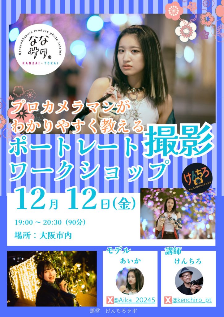 2025/11/03 大阪にてポートレート撮影をされて間もない方に向けた、ポートレートのワークショップを行います。 本ワークショップは「ななサク撮影会」様にご協力いただき開催いたします。 【大阪】11月3日(月・祝) はじめてのポートレートワークショップ … -