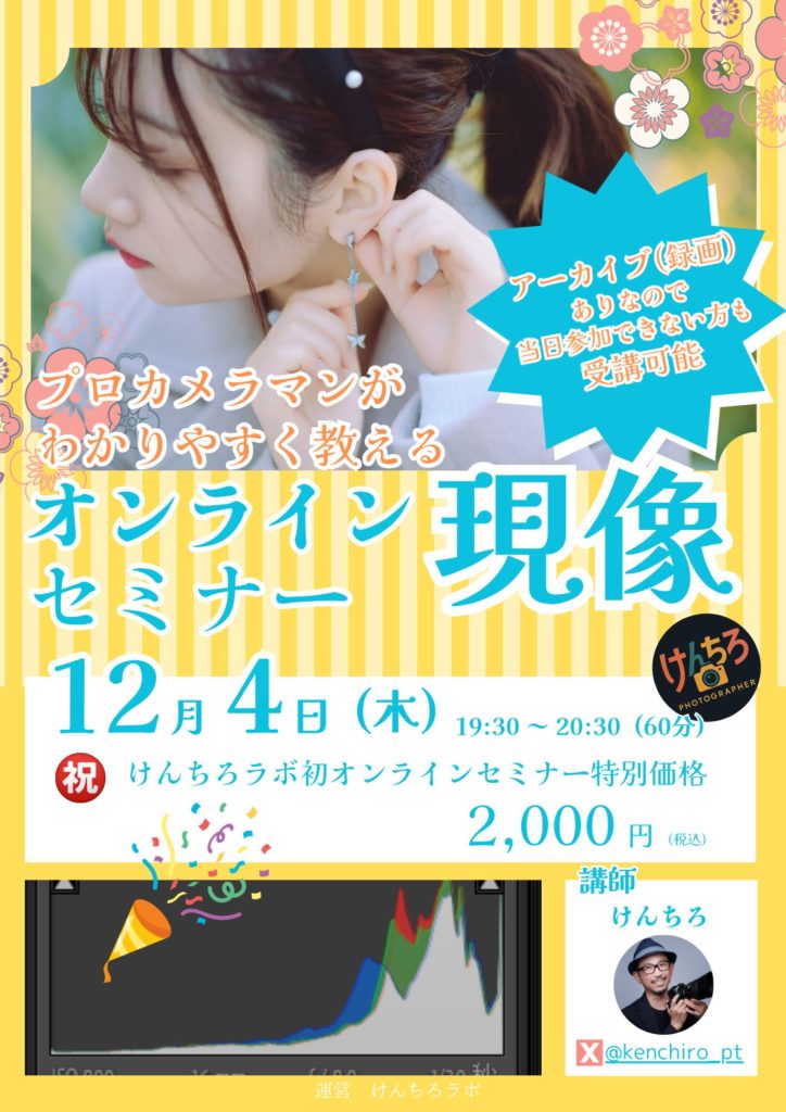 2025年12月04日(木)オンラインにて「現像の基礎」セミナーを開催いたします。 【オンライン】12月4日(木) 現像の基礎セミナー セミナー内容 ジャンル:現像難易度: 現像とは何か ヒストグラムの意味 各現像パラメーターの意味 ポートレート写真を現… -